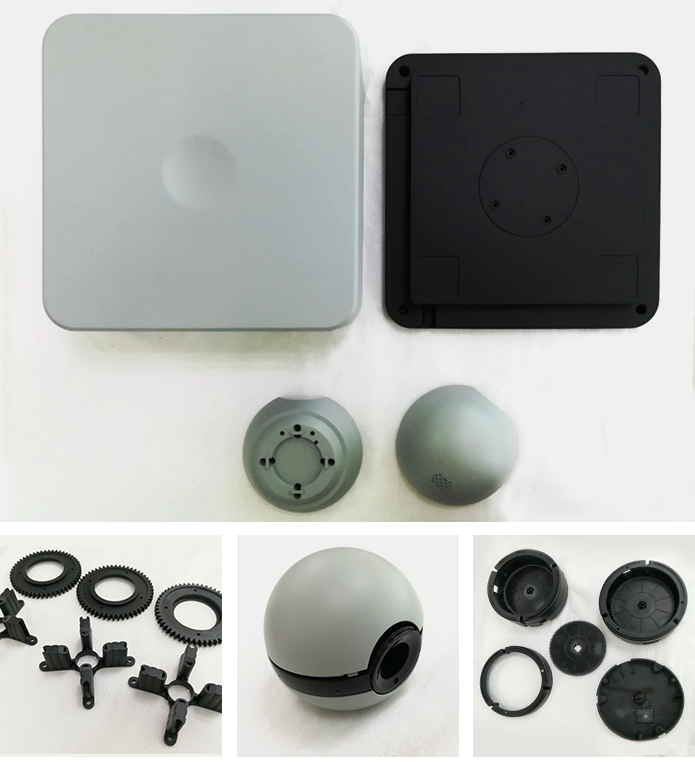 Here You can see several PCBs for base and camera units as well as components assembled on PCBs, as we use some flexible connectors for mics location to have sound direction detection. You can see improved mechanical designs manufactured according to parameters of motors and parts we’ve freezed for BOM. There were also some special needs for molding which we had to consider on our way to produce mechanical parts.