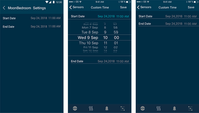 We've created SmartPage which will be one of the main pages of the App together with Landing page and Notifications. SmartPage consists of Sensors sub-page which will show Moon embedded sensors (currently they are CO2 / Humidity / Temperature (with the ability to switch between Celsius and Fahrenheit) and LUX (Light level in the area)). We decided minimal and maximal steps for filtering the data within Sensors and now there are Day / Week / Month steps. We combined all the charts into one big chart, so our users will be able to see a correlation between different sensors across the particular date.