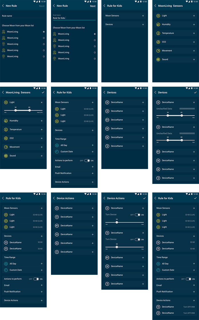 Most of the time was spent to finalize the “Rules” section as it's currently the most sophisticated element of the App. Within “Rules” section we had different ideas regarding the flow of the user, and came up with the following concept: user will be able to create the rule choosing particular Moon, it's embedded sensors, devices which are paired with this Moon (ZigBee / Z-Wave), choose time-frame and action to perform if the triggers resulted.